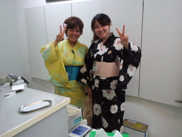 で、ルネサンス神戸では今日は浴衣DAYということで、女性スタッフさんたちが浴衣を着て働いておられました。写メは、ルネサンス神戸の受付嬢のお2人です(*^o^*)