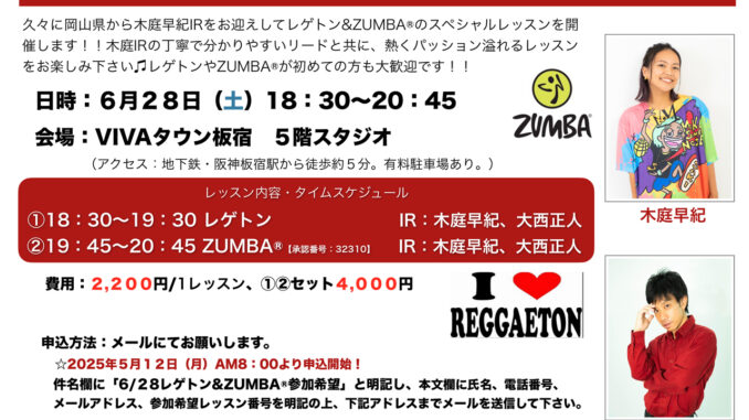 久々に岡山県から木庭早紀IRをお招きしてレゲトン&ZUMBA®のスペシャルレッスンを開催します!!