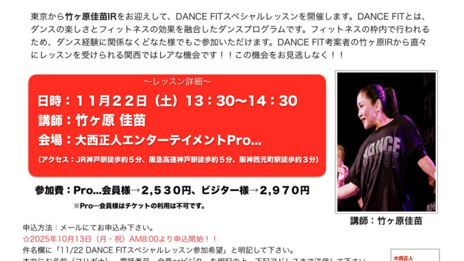東京から竹ヶ原佳苗IRをお招きしてDANCE FITスペシャルレッスンを開催します!!DANCE FIT創始者の竹ヶ原IRから直々にレッスンを受けられる関西ではレアな機会です!!この機会をお見逃しなく〜♫