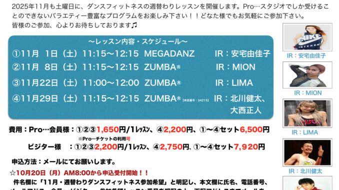 2025年11月も土曜日に、ダンスフィットネスの週替わりレッスンを開催します。
