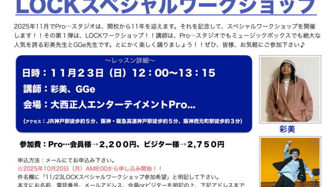 2025年11月でPro…スタジオは、開校から11年を迎えます。それを記念して、スペシャルワークショップを開催します。その第1弾は、LOCKワークショップ!!講師は、Pro…スタジオでもミュージックボックスでも絶大な人気を誇る彩美先生とGGe先生です。LOCKダンスが初めての方も大歓迎♫彩美先生とGGe先生が楽しくも丁寧に指導してくださいます。とにかく楽しく踊りましょう!!どなた様でもお気軽にご参加下さい♪