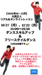 2025年10月から、リアル&オンラインレッスンがリニューアルします!!これまでマスタークラスは、レゲトンのみでしたが、様々なジャンルのダンスを踊っていきたいと思います。ダンス全般に必要な基礎や振付で使うステップをスキルアップセミナーとして練習してから、振付を踊っていきます。振付は1階完結型ですので、どなた様でもいつでもお気軽にご参加ください。