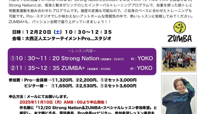 大阪を中心に活躍中のYOKO IRをお迎えして、Strong Nation&ZUMBA®︎のスペシャルレッスンを開催します♪
