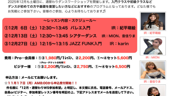 2025年12月も土曜日に、週替わりのダンスワークショップを開催します。