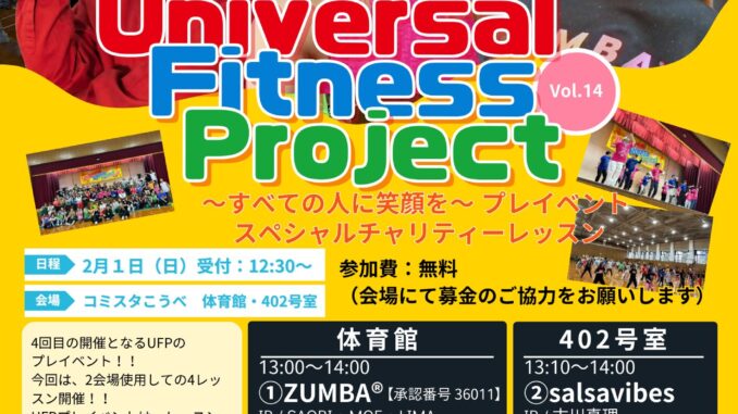 Universal Fitness Project vol.14〜すべての人に笑顔を〜のプレイベントとして、スペシャルチャリティーレッスン&ダウン症児者等のダンスチームによるショータイムを開催します!!今回は、コミスタこうべの体育館と402号室の2会場を使用して4レッスンを開催します。皆様のお力添え、よろしくお願いします。