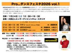 件名欄に「1/24Pro…ダンスフェスタ2026 vol.1参加希望」と明記し、本文欄に氏名、電話番号、会員orビジター、参加希望レッスン番号を明記の上、下記アドレスまでメールを送信して下さい。