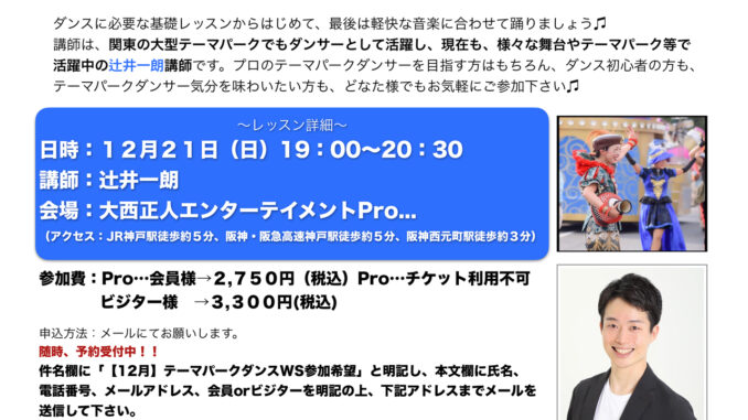 件名欄に「12月 テーマパークダンスWS参加希望」と明記し、本文欄に、氏名、電話番号、メールアドレス、会員orビジターを明記の上、下記アドレスまで送信して下さい。