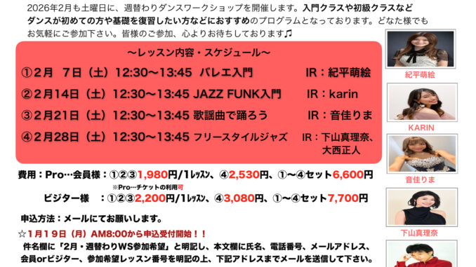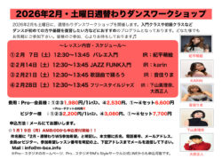 2026年2月も土曜日に、週替わりのダンスワークショップを開催します。