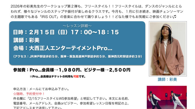 2026年の彩美先生ワークショップの第2弾も、先月に引き続き、フリースタイルダンスです!!フリースタイルは、ダンスのジャンルにとらわれず、様々なジャンルのステップや振付を楽しむことができるクラスです。2月も、映画チェンソーマンの主題歌でもある「IRIS OUT」の音楽に合わせて踊りましょう!どなた様でもお気軽にご参加ください☆