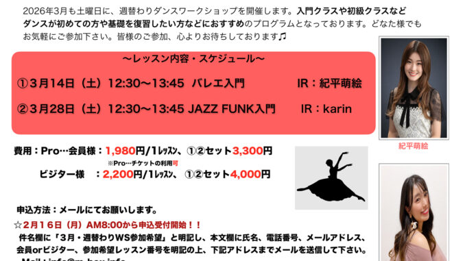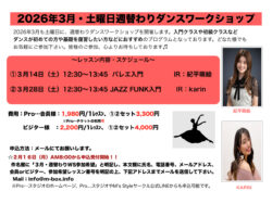 2026年3月も土曜日に、週替わりのダンスワークショップを開催します。