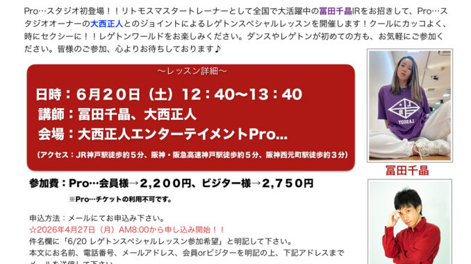 Pro…スタジオ初登場!!リトモスのマスタートレーナとして全国で大活躍中の冨田千晶IRをお招きして、Pro…スタジオオーナーの大西正人とのジョイントによるレゲトンスペシャルレッスンを開催します!クールにカッコよく、時にセクシーに!!レゲトンワールドをお楽しみください。